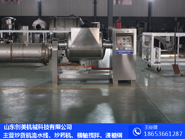 山東創美機械主要生產炒貨機,炒貨機流水線,大型浸糖鍋,及橫軸攪拌炒鍋殺菌鍋等具體可咨詢客服